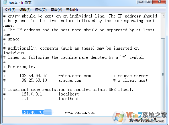 如下圖所示,紅框部分是小編添加的,目地就是把www.baidu.com 這個(gè)域名指向到127.0.0.1這個(gè)IP(這個(gè)IP指向本機(jī))也就是什么都打不開(kāi)了。