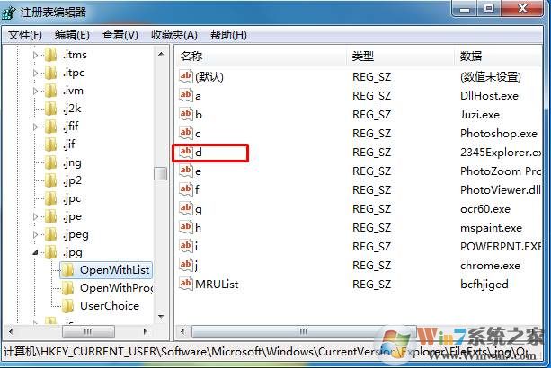 2、按以下的地址查找: HKEY_CURRENT_USER\Software\Microsoft\Windows\CurrentVersion\Explorer\FileExts\jpg\OpenWithlist ,此時,我們就能夠看到打開jpg圖片的打開方式選項程序,有很多, 如下圖所示: