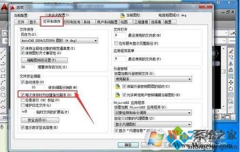 2、彈出的選項(xiàng)對話頁面中,選擇打開和保存,在文件安全措施下有一個(gè)選項(xiàng),每次保存時(shí)均創(chuàng)建備份副本,這外對勾去掉,然后點(diǎn)擊確定,這個(gè)圖形文件保存時(shí),就不會有相應(yīng)的*.BAK文件了;