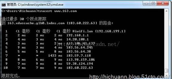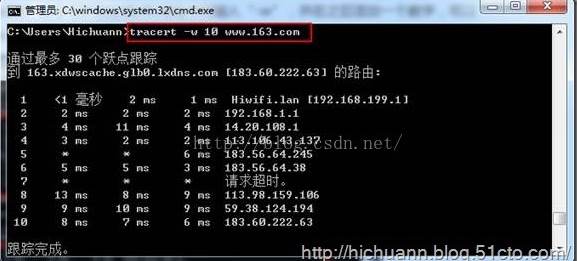 不帶選項(xiàng)的tracert命令將顯示到達(dá)目標(biāo)IP地址所經(jīng)過的路徑,并將IP地址解析為主機(jī)名一同顯示。如下圖所示,第一跳是網(wǎng)關(guān)地址,可以根據(jù)看到的主機(jī)名,判斷我使用的是極路由。