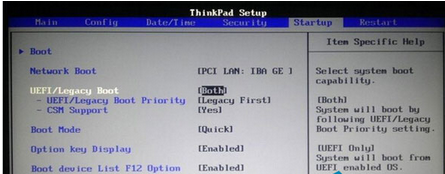 2、接下來切換到“Startup”選項,將光標移至“UEFI/Legacy Boot”,同樣地按Enter鍵在彈出的窗口中將UEFI/Legacy Boot選項的值設置“Both”;隨后將光標移至“UEFI/Legacy Boot Priority”,按Enter鍵在彈出的選項窗口中選擇“UEFI First”。如下圖所示: