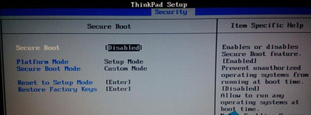 1、開機,然后按快捷鍵進入到bios設置界面,切換到security選項,通過鍵盤上的上下方向鍵選擇“secure boot”選項,接著按Enter鍵,在彈出的窗口中選擇“Disabled”,如下圖所示: