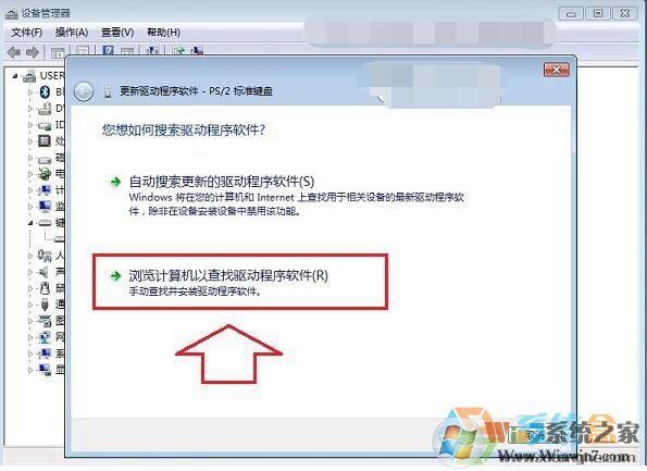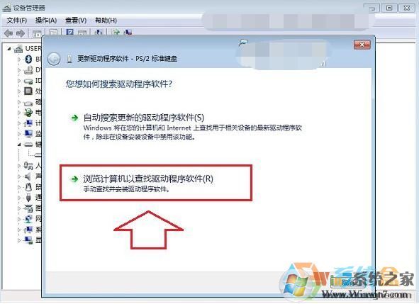 三、打開(kāi)筆記本設(shè)備管理器之后,找到【鍵盤(pán)】,點(diǎn)擊展開(kāi),然后在【PS/2標(biāo)準(zhǔn)鍵盤(pán)】上右鍵鼠標(biāo),然后選擇【更新驅(qū)動(dòng)程序軟件】,如下示意圖所示。