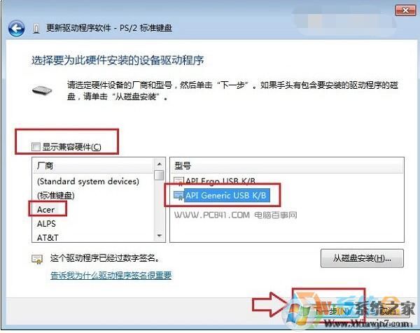 六、下面的這步“選擇要為此硬件安裝的設(shè)備驅(qū)動(dòng)程序”設(shè)置非常重要,首先要將【顯示兼容硬件】前面的勾去掉,然后在廠商里,任意選擇一個(gè)其他筆記本品牌,比如筆者用的是聯(lián)想筆記本,在這里我們故意選擇“宏碁(Acer)”廠商,然后在右側(cè)的型號(hào)里,任意選擇一個(gè),完成后點(diǎn)擊下面的【下一步】,如下圖所示。