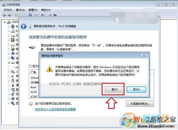七、最后會(huì)彈出一個(gè)“不腿甲安裝這個(gè)設(shè)備的驅(qū)動(dòng)程序,因?yàn)閃indow無(wú)法驗(yàn)證這個(gè)驅(qū)動(dòng)程序是否與硬件兼容...”,這里我們直接點(diǎn)擊底部的【是】,如下圖所示。