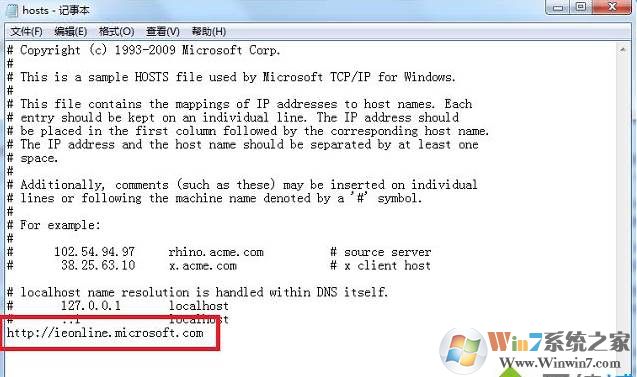 3、打開“hosts”文件后,在最下方添加上“http://ieonline.microsoft.com”,然后點擊“文件--保存”,如果修改不了,可以先復(fù)制一份到桌面或其他目錄下,再進行修改,之后替換掉原來的“hosts”文件即可。