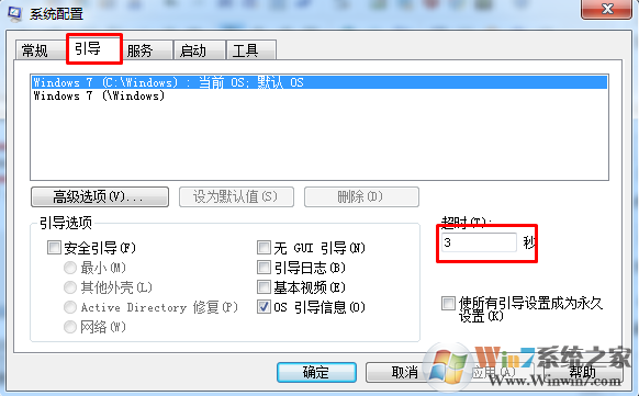 2.之后就可以打開(kāi)如下圖中所示的系統(tǒng)配置窗口了,需要將界面切換到引導(dǎo)這一欄中,之后就可以看到窗口中的超時(shí)這個(gè)選項(xiàng)了,需要在這里設(shè)置一個(gè)適合的數(shù)字,不過(guò)需要注意的是一定不要設(shè)置為0,因?yàn)檫@樣有可能造成系統(tǒng)的損壞,這個(gè)數(shù)字便是開(kāi)機(jī)時(shí)間了,不過(guò)各位在設(shè)置的時(shí)候一定要記得給系統(tǒng)一定的反應(yīng)時(shí)間才好!
