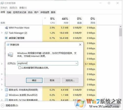 2、然后在任務(wù)管理器中點(diǎn)擊 文件—新建任務(wù)運(yùn)行,輸入explorer.exe 回車