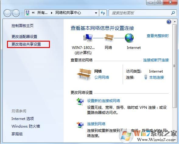 1、打開(kāi)網(wǎng)絡(luò)和共享中心,然后點(diǎn)高級(jí)網(wǎng)絡(luò)設(shè)置