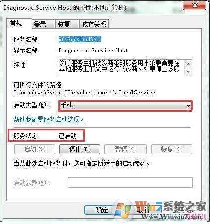 4、接著找到diagnostic service host服務(wù),啟動類型為手動,同樣啟動服務(wù),這時顯示服務(wù)狀態(tài)改為已啟動,并確定保存設(shè)置,如圖所示:
