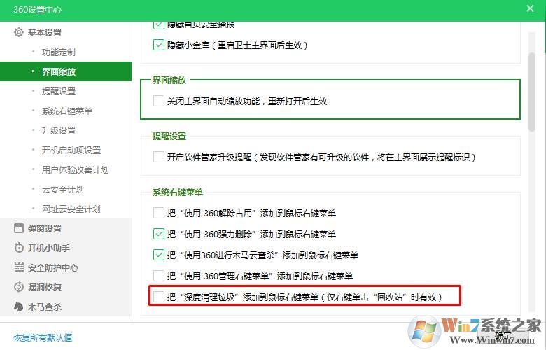 2、在設(shè)置中找到 把“深度清理垃圾”添加到鼠標(biāo)右鍵菜單,的選項(xiàng)取消勾選;
