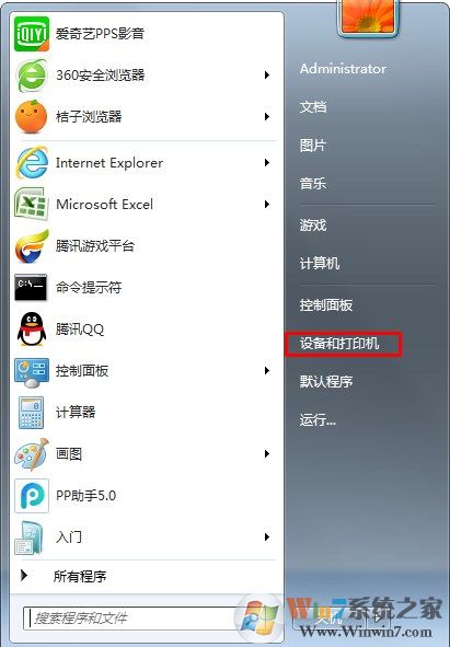 1、在開始菜單打開設(shè)備和打印機(jī),找不到先打開控制面板,然后選擇設(shè)置和打印機(jī)