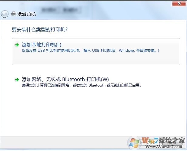 4、選擇一個(gè)需要添加的打印機(jī)類型,有線或無線兩種模式,如果是連接自己電腦的打印機(jī)就選擇本地連接,是網(wǎng)絡(luò)打印機(jī)的話就選擇下面一個(gè)打印方式: