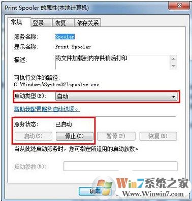 7、在彈出的print spooler屬性窗口中,在常規(guī)標(biāo)簽下,將啟動(dòng)類型設(shè)置為自動(dòng),服務(wù)狀態(tài)設(shè)置為啟動(dòng),如果已是啟動(dòng)狀態(tài),先停止再啟動(dòng)