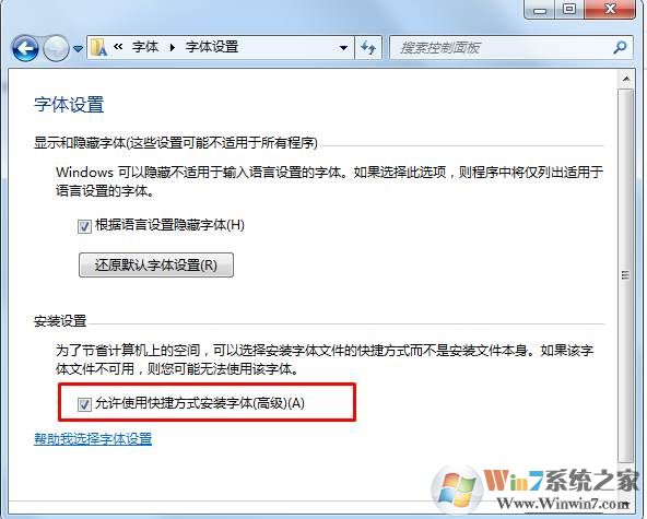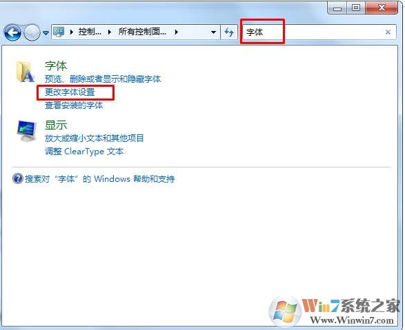 1、打開控制面板,然后搜索“字體”(或是小圖標(biāo)方式查看,點(diǎn)擊擊字體)并點(diǎn)擊更改字體設(shè)置;