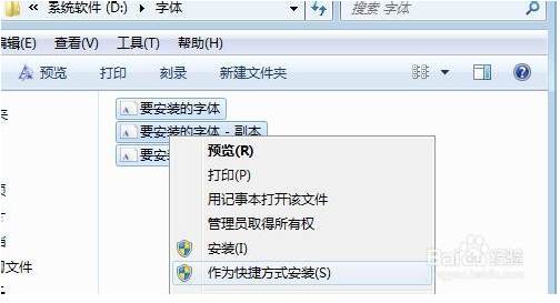 3、這時(shí)我們選擇要安裝的字體右鍵,或是批量選擇字體后右鍵點(diǎn)擊,就會(huì)出現(xiàn)“作為快捷方式安裝”的選項(xiàng);