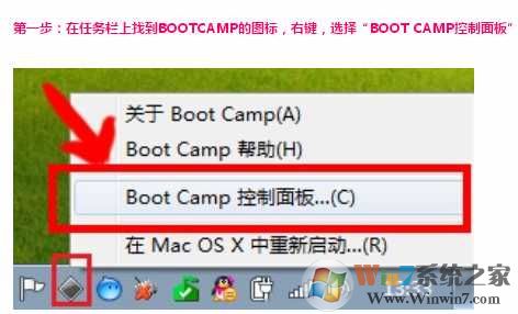 2、安裝過BootCamp后,右下角會有一個圖標,右鍵點擊,打開Boot Camp控制面板;以下為Win7為例,其實Win10也是一樣的哦