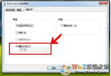 3、然后在觸控板設(shè)置界面下,勾選輔助點擊(右下角)確定。