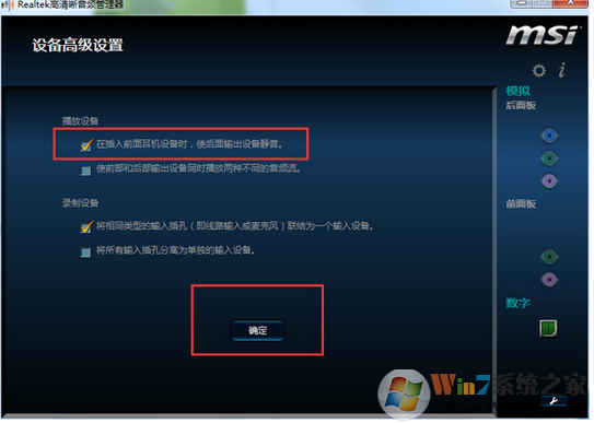 4、選擇“在插入前面耳機(jī)設(shè)備時,使后面輸出設(shè)備靜音。”點(diǎn)“確定”退出。如果默認(rèn)是這項(xiàng),則無須更改;