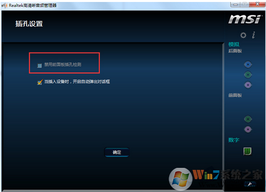 6、勾選”禁用前面板設(shè)置時檢測“,點(diǎn)確定退出。然后就可以同時用音箱和耳機(jī)了,開關(guān)音箱,耳機(jī)都有聲音