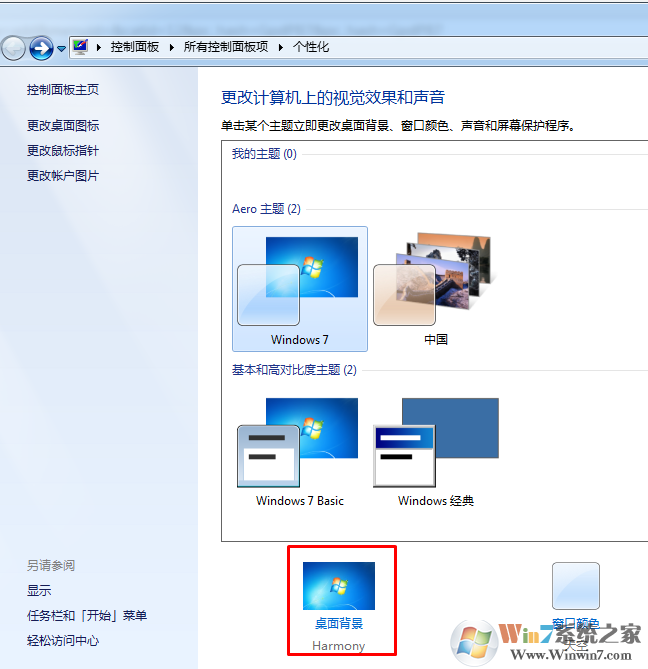2.在打開(kāi)的個(gè)性化窗口中,選擇底部的桌面背景
