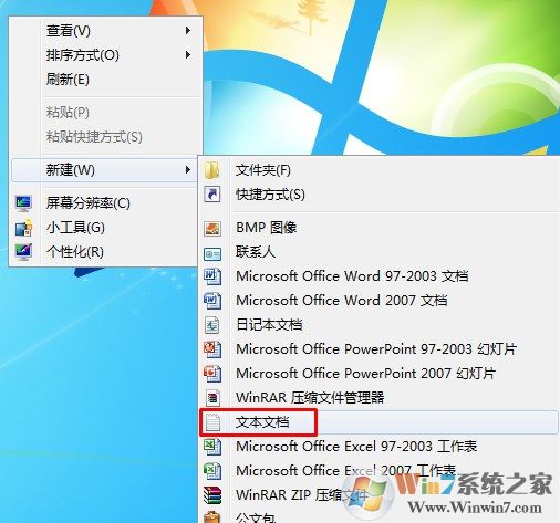 1.首先,返回到Win7旗艦版電腦的桌面位置,然后在桌面找到一個(gè)空白處,點(diǎn)擊鼠標(biāo)右鍵,在下滑菜單中選擇新建-文本文檔。
