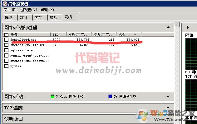 3、切換到網(wǎng)絡(luò),這時我們發(fā)現(xiàn)了 sogoucloud.exe這個進(jìn)程在不停的發(fā)包,所以上行才會占用了7MB多 對,這個進(jìn)程就是搜狗輸入法的。就算是家用電腦。你隨時占著我7MB或者更多的帶寬,我還能愉快的玩耍不?