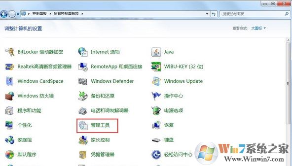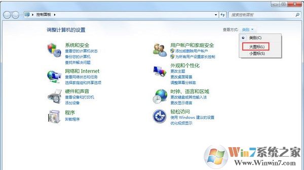 1、打開控制面板,在右上角的查看方式中,選擇大圖標(biāo)。這樣你就能看到控制面板里的所有項(xiàng)目。如下圖所示: