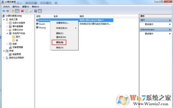 6、很多朋友看到這里,很興奮。因?yàn)槲覀円恢逼诖腁dministrator賬戶終于快要真正現(xiàn)身了。低調(diào)。將鼠標(biāo)選擇到右欄的Administrator賬戶名稱上,單擊右鍵,找到屬性,單擊,如下圖所示: