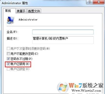 7、打開屬性后,就能看到三個(gè)大項(xiàng)目的設(shè)置,常規(guī)項(xiàng)下可以明顯看到在“賬戶已禁用”前的方框打上了對(duì)勾,取消它。點(diǎn)擊確定就可以了。