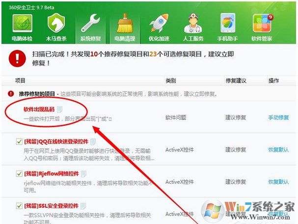 3、安裝好Microsoft AppLocale后重啟電腦,打開軟件還是有亂碼,這時(shí)就嘗試另外的方法。在電腦上安裝安全衛(wèi)士軟件,測(cè)試時(shí)使用的是360安全衛(wèi)士,利用系統(tǒng)修復(fù)掃描系統(tǒng),會(huì)顯示一條軟件出現(xiàn)亂碼的錯(cuò)誤,點(diǎn)擊修復(fù)按鈕開始修復(fù);