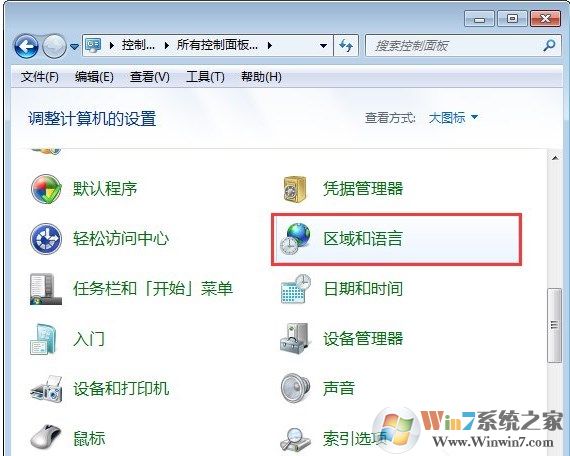 2、在“控制面板”中選擇“區(qū)域和語言”選項(xiàng);