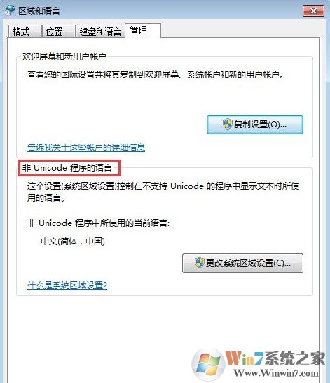3、在“區(qū)域和語言”屬性對(duì)話框中,切換到“管理選項(xiàng)”,這時(shí)會(huì)看到“非Unicode程序的語言”,這就是在設(shè)置語言時(shí)設(shè)置不當(dāng)造成的;