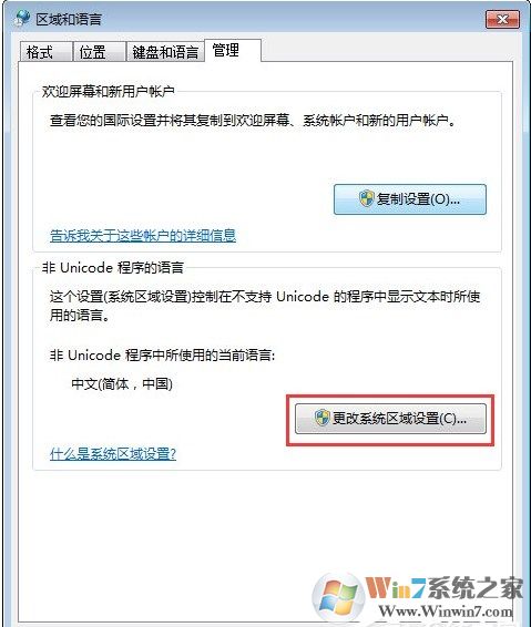 4、點(diǎn)擊“管理選項(xiàng)”屬性對(duì)話框中的“更改系統(tǒng)區(qū)域設(shè)置”;