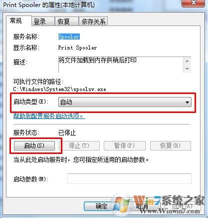 3、在“Print Spooler”服務設置窗口中,將“啟動類型”設置為“自動”,點擊“啟動”按鈕;此時系統(tǒng)會嘗試啟動該服務。