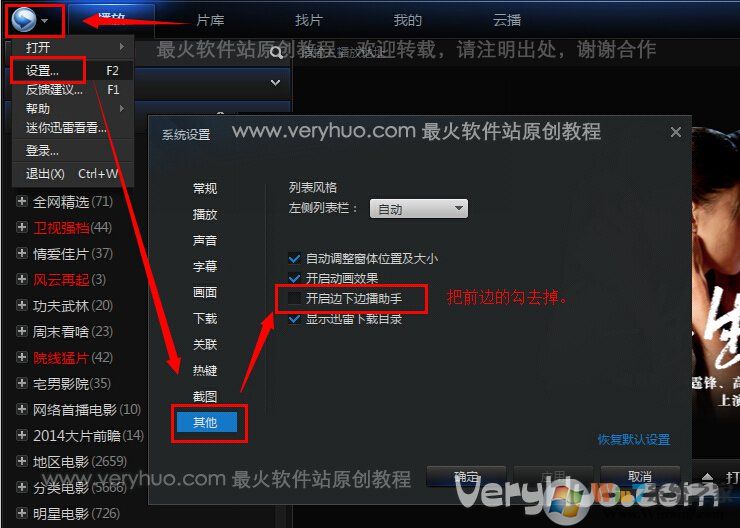 第二步,打開迅雷看看播放器,單擊【左上角的圖標(biāo)】,然后點擊【設(shè)置】,再點擊【其他】,將【開啟邊下邊播助手】前邊的勾選取消,并點擊確定。