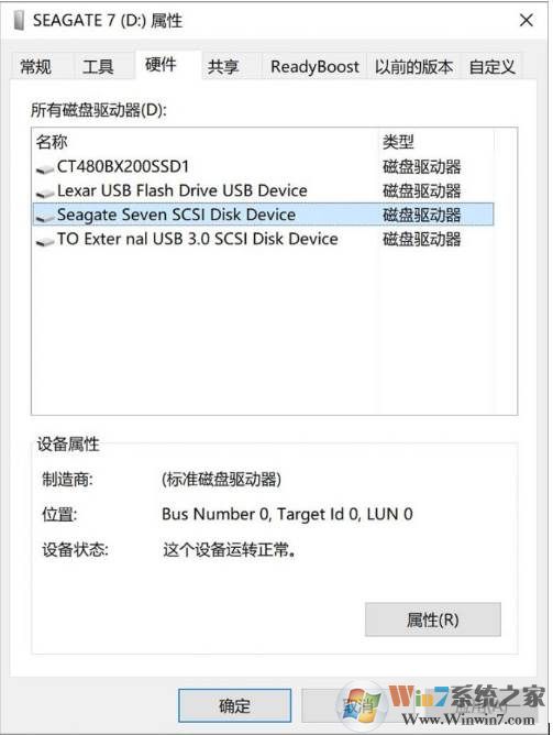 2、在列出的硬盤列表中選擇要加速的移動硬盤(如,小編的是一塊希捷的硬盤),雙擊,打開這塊硬盤的屬性界面,點擊左下的“改變設置”按鍵。