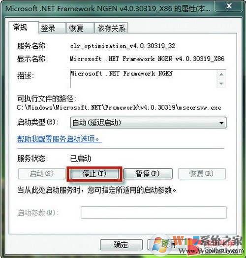 3、最后把這個服務(wù)的啟動類型設(shè)置為禁用,并停止服務(wù),這樣mscorsvw.exe進(jìn)程就會消失了,自然也不會占用CPU了。