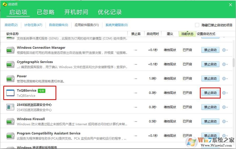 2、通過小編測試,禁用該服務之后對QQ瀏覽器也沒什么影響,不需要的朋友可以在服務中禁用TsQBservice服務,或是使用360來禁用,如下圖;