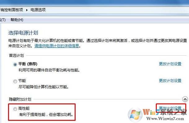 3、在隱藏計(jì)劃中找到高性能模式,并選擇,然后點(diǎn)擊更改計(jì)劃設(shè)置;