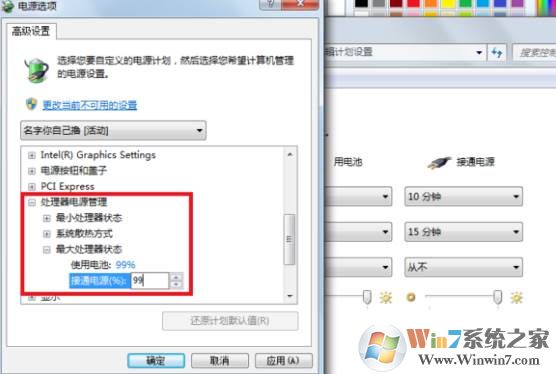 5、這時(shí)在高級(jí)電源設(shè)置中,展開 處進(jìn)器電源管理—最大處理器狀態(tài),設(shè)置為99%,然后確定保存。