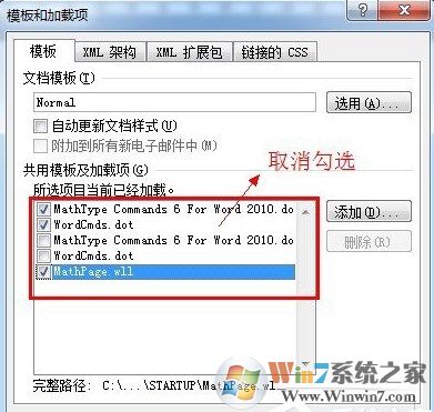 5、就會跳出一個模板類別的對話框,在中,將和Mathtype相關(guān)的選項都取消勾選。