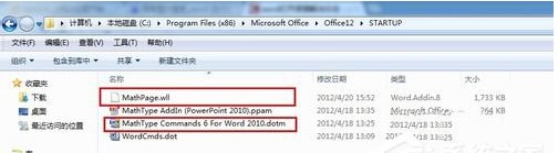 6、如果不行,則可以找到office的安裝文件夾,找到“office12”文件夾里面有個以“STARTUP”命名的文件夾。(以我的電腦為例是在C:\Program Files (x86)\Microsoft Office\Office12\STARTUP——地址因人而異。反正是在office的安裝文件下。),將這個文件夾的MathPage和MathType兩個文件刪除。