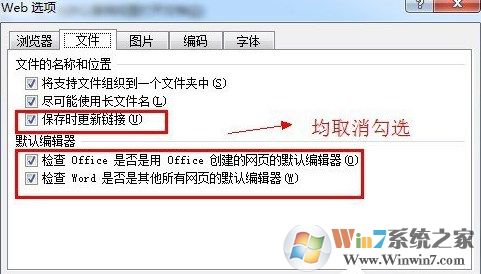 5、點擊第2步驟圖中的“web選項”,選擇“文件”選項卡,按照如下圖進行設(shè)置: