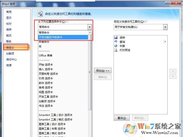 4、打開的對話框中,在左側(cè)的菜單欄中點擊“自定義”。在自定義菜單選項下,設(shè)置“從下列位置選擇命令”為“不在功能區(qū)中的命令”。