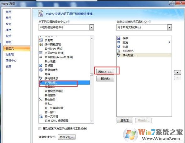 5、滾動并選擇“拼寫檢查”。單擊“添加”-“確定”。
