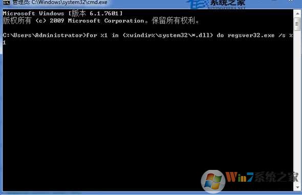 “for %1 in (%windir%\system32\*.dll) do regsvr32.exe /s %1”,注意空格不能有輸入錯(cuò)誤,引號(hào)不需要輸入,按住回車鍵,即Win7系統(tǒng)會(huì)將“%windir%\system32\”下所有的DLL文件注冊(cè)一遍,時(shí)間有點(diǎn)久,一定要耐心等待。