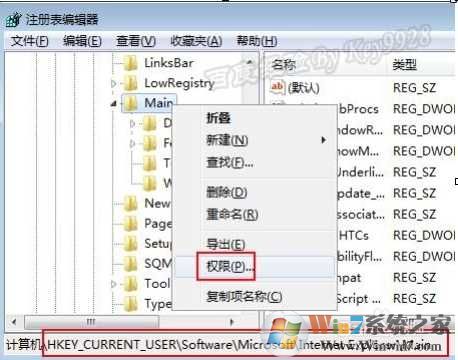 2、依次展開(kāi)到HKEY_CURRENT_USER\Software\Microsoft\Internet Explorer\下,右擊下面的“Main”項(xiàng),并選擇“權(quán)限”: