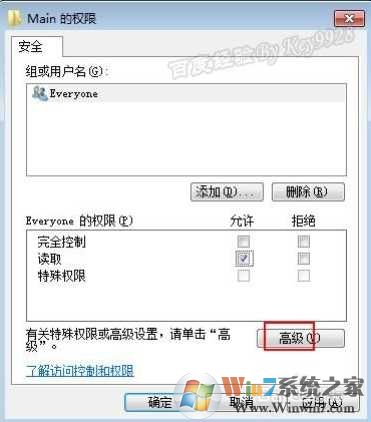 3、在打開(kāi)的“Main的權(quán)限”對(duì)話框中單擊“高級(jí)”按鈕:
