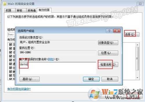 4、切換到“有效權(quán)限”選項(xiàng)卡,點(diǎn)擊“選擇”按鈕,添加當(dāng)前win7系統(tǒng)帳號(hào),并“應(yīng)用”:(如果是Adminitrator就添加administrator)